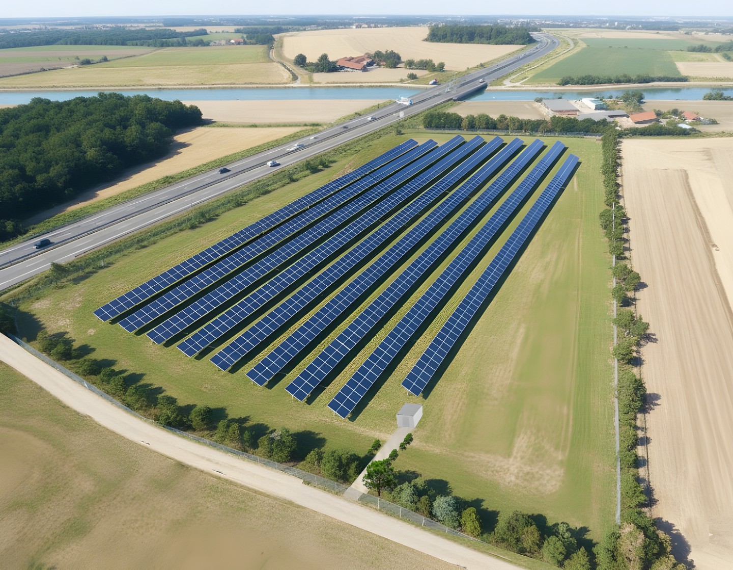 Der Agri-Solarpark entsteht auf zwei Flächen von insgesamt 13,2 Hektar im Bereich der Straße Hartmannsbrook in Amelsbüren, errichtet von dem Photovoltaik-Unternehmen EcotecWorld. Mit einer Leistung von 4.875 kWp wird die Photovoltaikanlage jährlich rund 5,75 Gigawattstunden Ökostrom erzeugen. Die Lieferung erfolgt über einen Direktanschluss an die Fraunhofer FFB, die auf der anderen Seite des Kanals im Hansa-Business-Park ihren Sitz hat. Die Anlage wird bodennah aufgeständert und als sogenannte 2P-Tracking-Photovoltaikanlage konstruiert. Sensoren sorgen dafür, dass sich die Solarmodule zu jeder Tageszeit optimal zur Sonne ausrichten und maximal Sonne ernten. Die Konstruktion überbaut nur rund 12,7 Prozent der landwirtschaftlichen Fläche. Der Rest steht für den Anbau von Getreide, Raps und Ackerbohnen zur Verfügung.